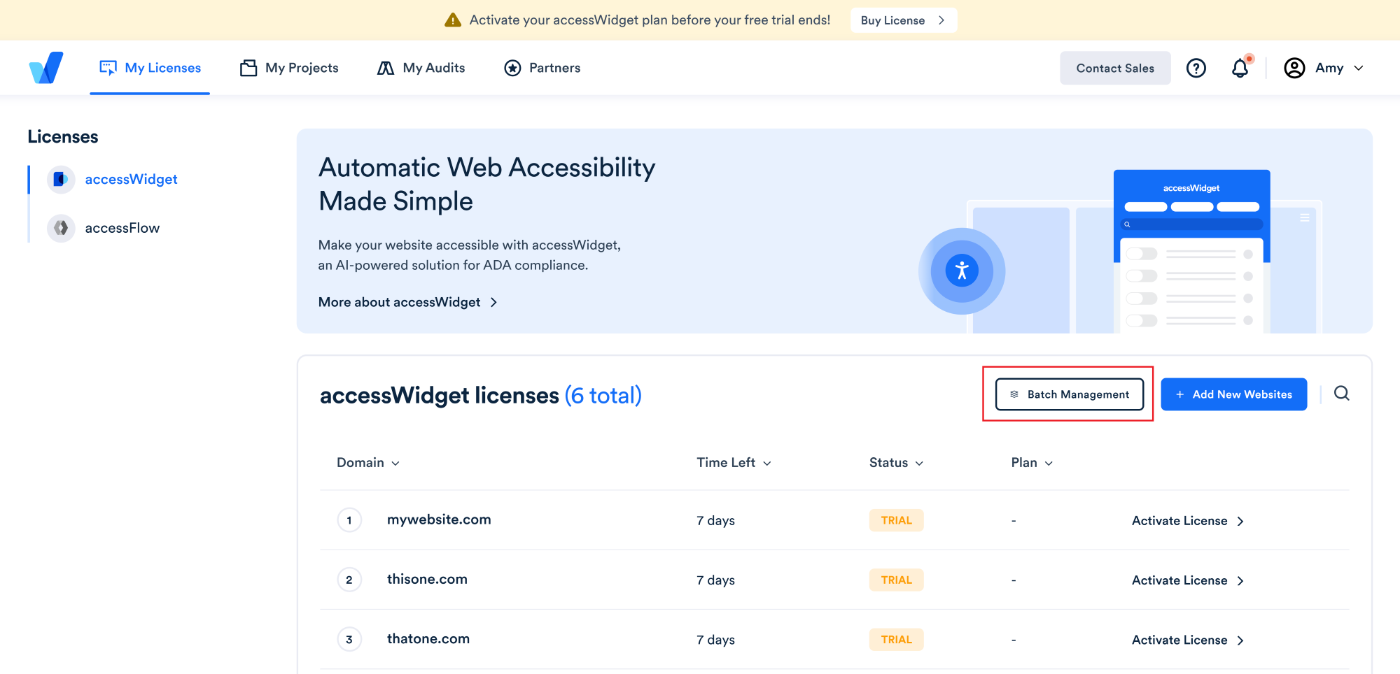 - Go to My Licenses on the top menu. Here you will find a list of all the websites that you have registered for an accessWidget license.