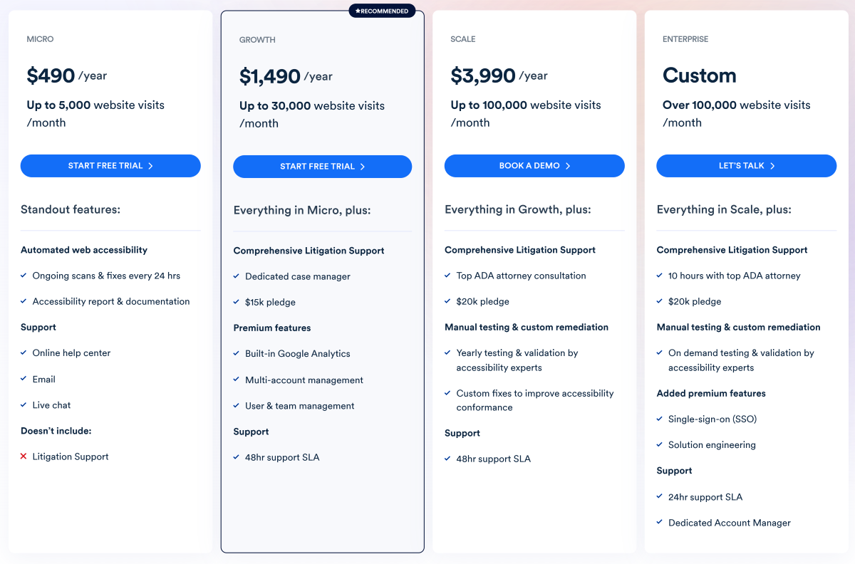 As part of our mission to make the entire Internet accessible, we vow to keep prices affordable for everyone, always. The only thing that determines the price is your page count. Although all plans receive the full suite of accessibility features, it’s important to select the correct payment plan.
