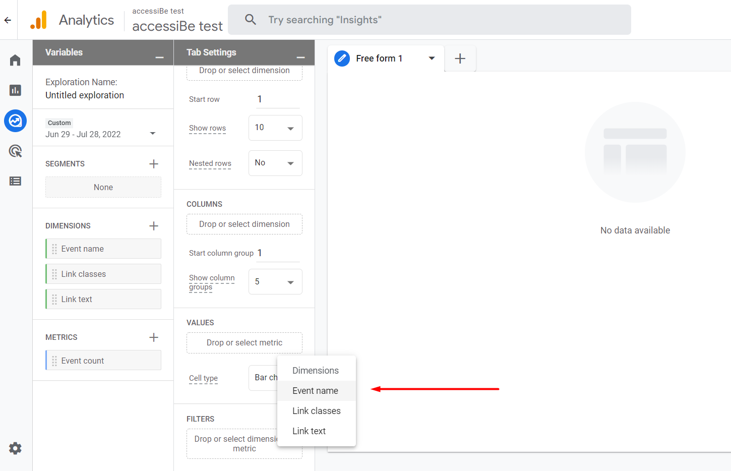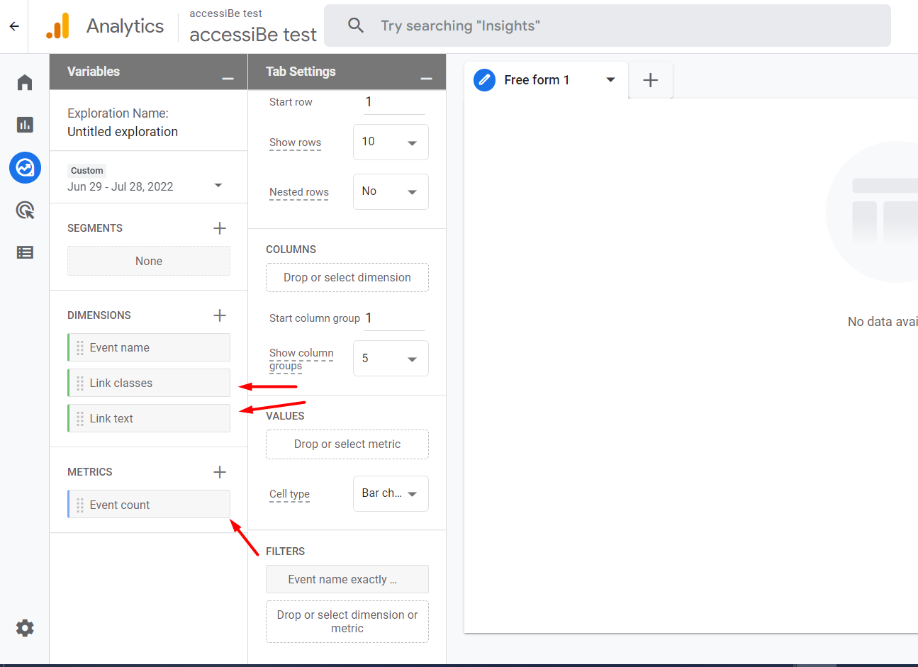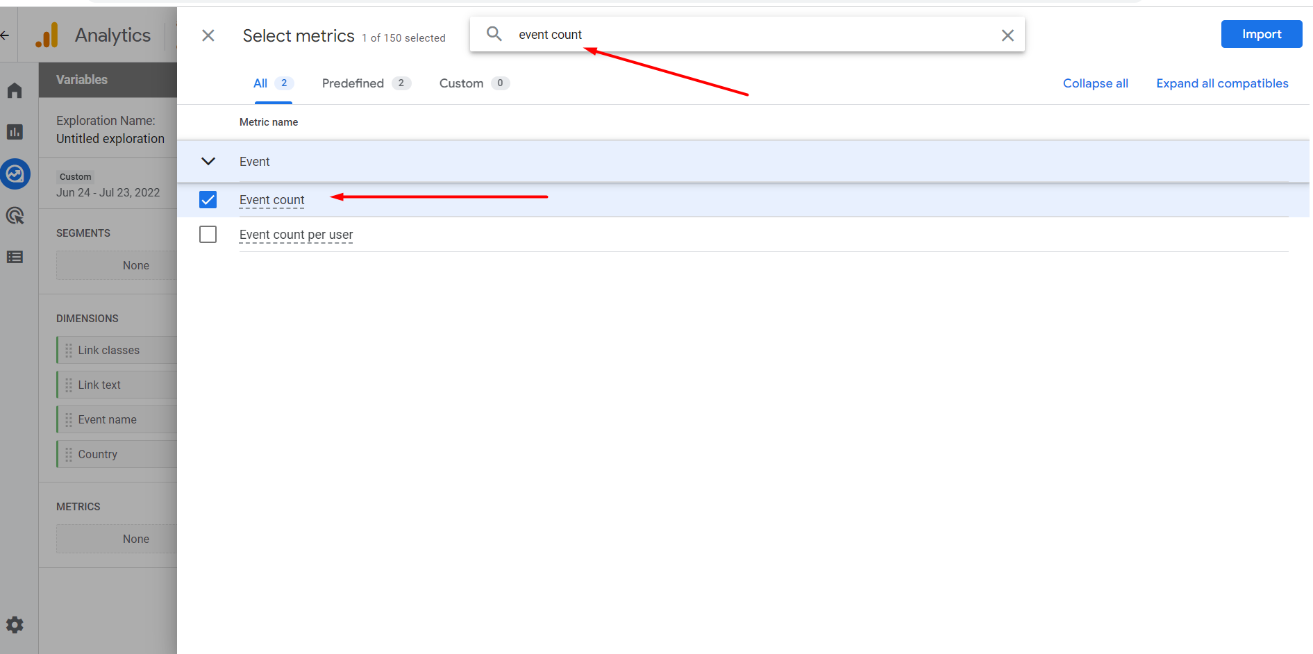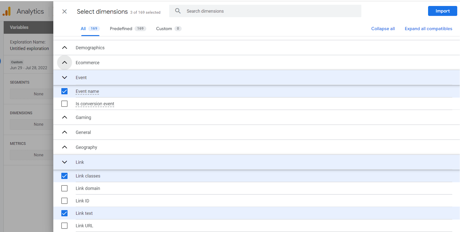 In "Select dimensions" search and add "Event Name", "link classes" "link text", and click import.