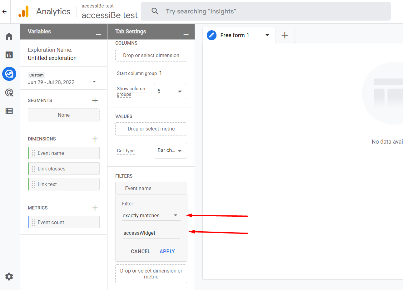 - Filter by “exactly matches”, type “accessWidget” and click Apply