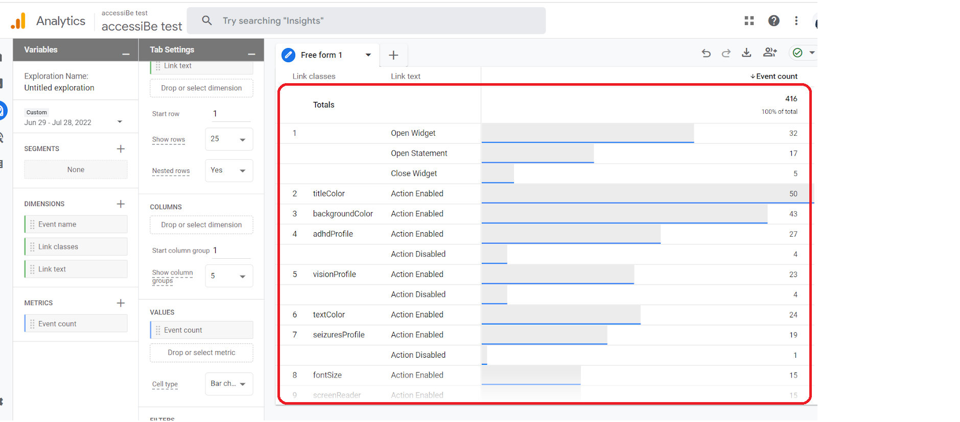 Google Analytics allows customers to see information and data regarding accessWidget usage on their sites, such as the number of profile clicks, user areas, and more.